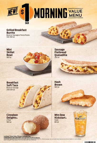 Taco Bell Debuts New Toasted Breakfast Burrito Menu Reminding Fans That Breakfast Burritos Are Better Left To Burrito Experts from www.tacobell.com A warm flour tortilla filled with grilled and marinated steak, fluffy eggs, 3 cheeses, potatoes and pico de gallo all toasted to perfection. Taco bell's breakfast taco is 230 calories and costs $1.00. However, most locations serve breakfast between 7 a.m. From the classic breakfast crunchwrap to discovering your new favorites like the grande toasted breakfast burrito with steak and the hash brown toasted breakfast burrito. Taco bell's hours vary by location because they're determined by the franchise owner. With taco bell's completely customizable breakfast menu, the options are nearly endless! At your nearby taco bell® location, you can find all of your favorite mexican inspired breakfast items. Find your nearby taco bell at 357 mountain parkway in salyersville.